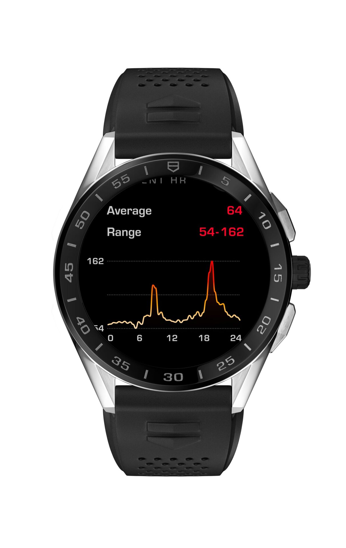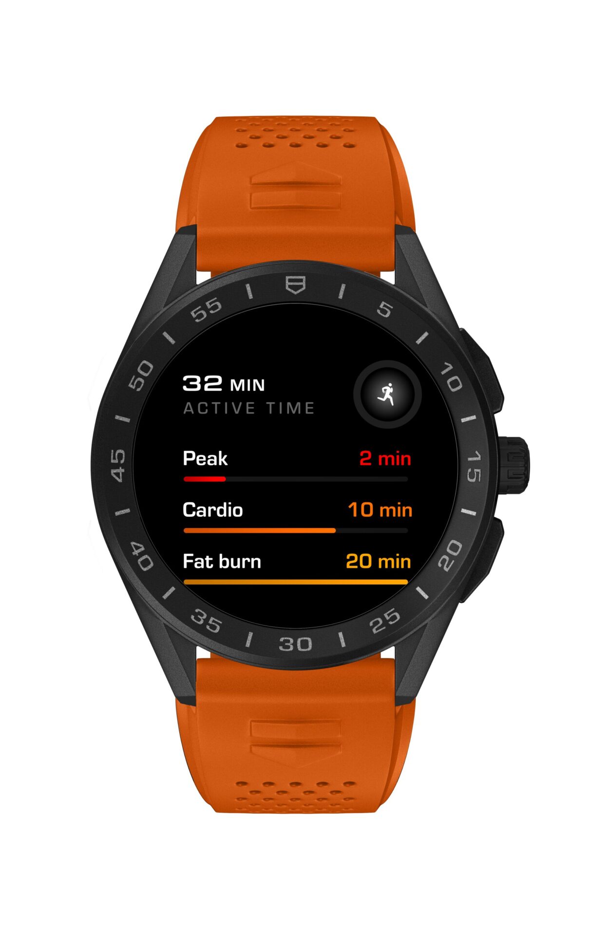 Com um olhar de relance no TAG Heuer Connected, o usuário pode monitorar suas atividades diárias (número de passos), intensidade do exercício (tempo gasto em cada semana fazendo exercícios moderados a vigorosos), o nível de esforço percebido pelo corpo (monitoramente dos batimentos cardíacos em tempo real e contiuamente), e a quatindade de impacto do exercício (queima de calorias).