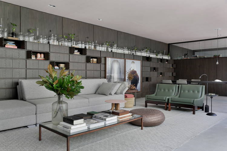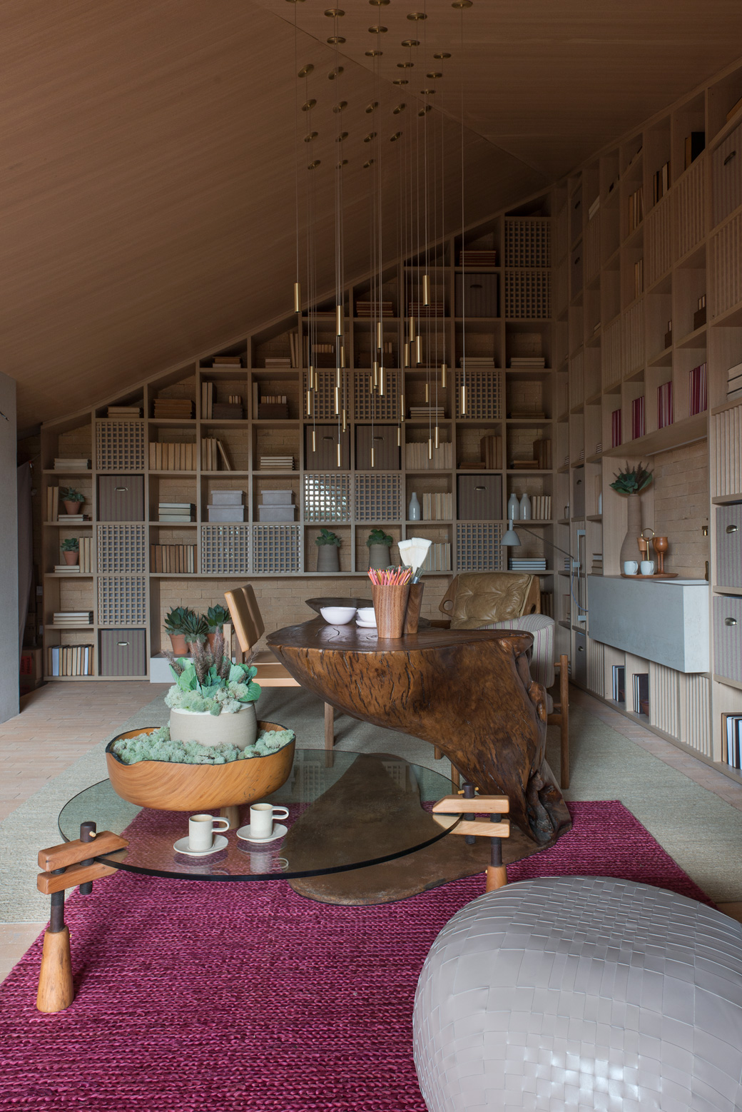 Mar por Andrea Teixeira e Fernanda Negrelli: Tendo em mente a ideia de praias paradisíacas com inspiração asiática como cenário e paisagem, o ambiente idealiza um refúgio caiçara, de natureza rústica, que exalta sofisticação com o uso de materiais naturais. Com poucos móveis – contando apenas com o necessário – o espaço dispõe de sala de estar, com adega e uma bela e imensa lareira que, nos dias frios, se torna o canto perfeito para degustar bons vinhos.