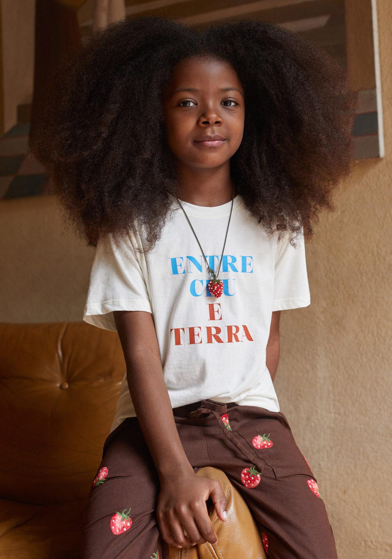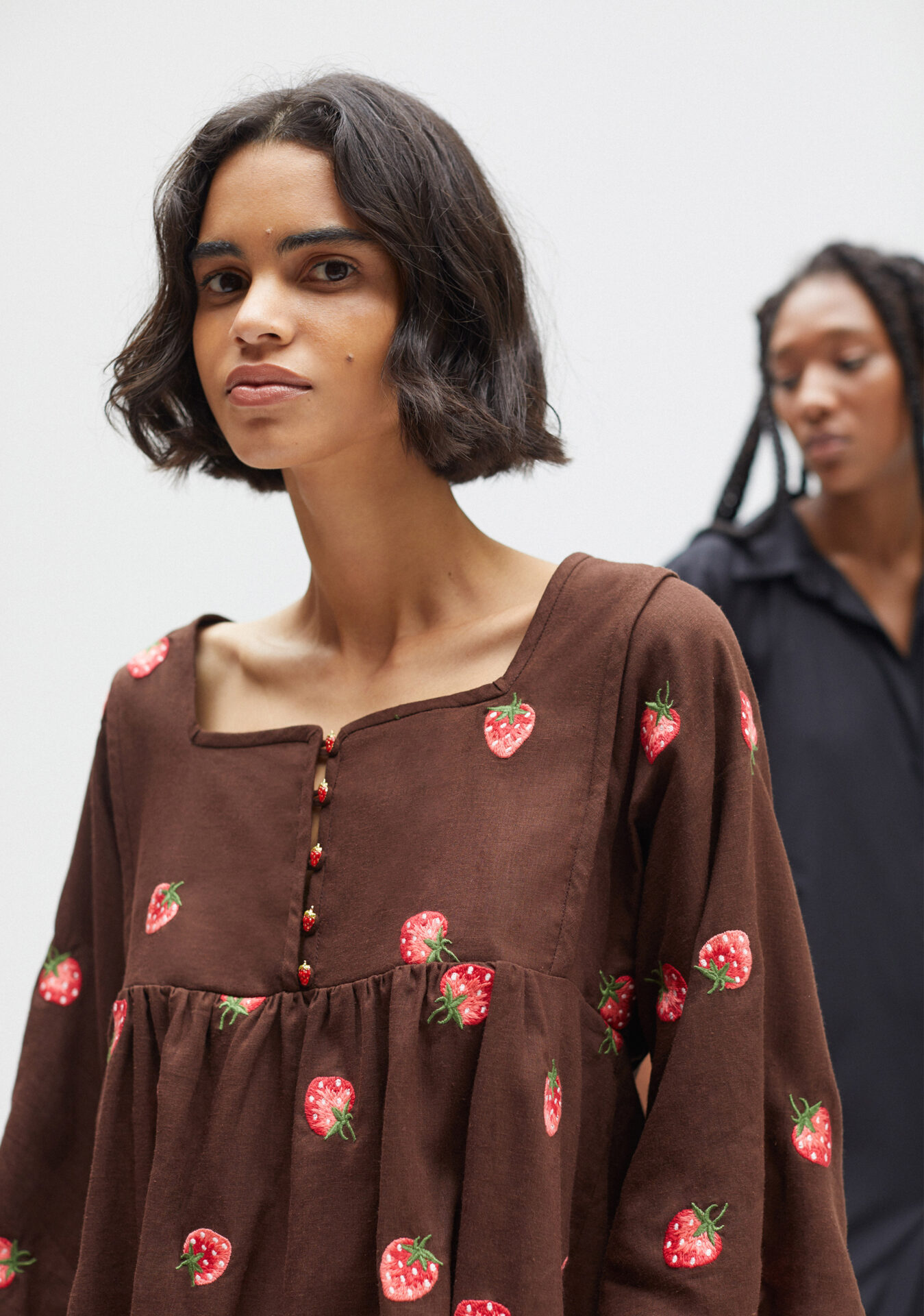 Destaque para o bordado de morango com fundo marrom, dando um ar lúdico e divertido na coleção, além de homenagear o renascimento da natureza. Com pontos especiais, a fruta aparece em looks tal mãe tal filha, seja na bata, nos vestidos soltos de manga longa no adulto e sem manga com leve plissado no mini. Atenção especial nos detalhes, como nos botões de morango em metal ou na versão maxi em veludo 3D na camisa off.
