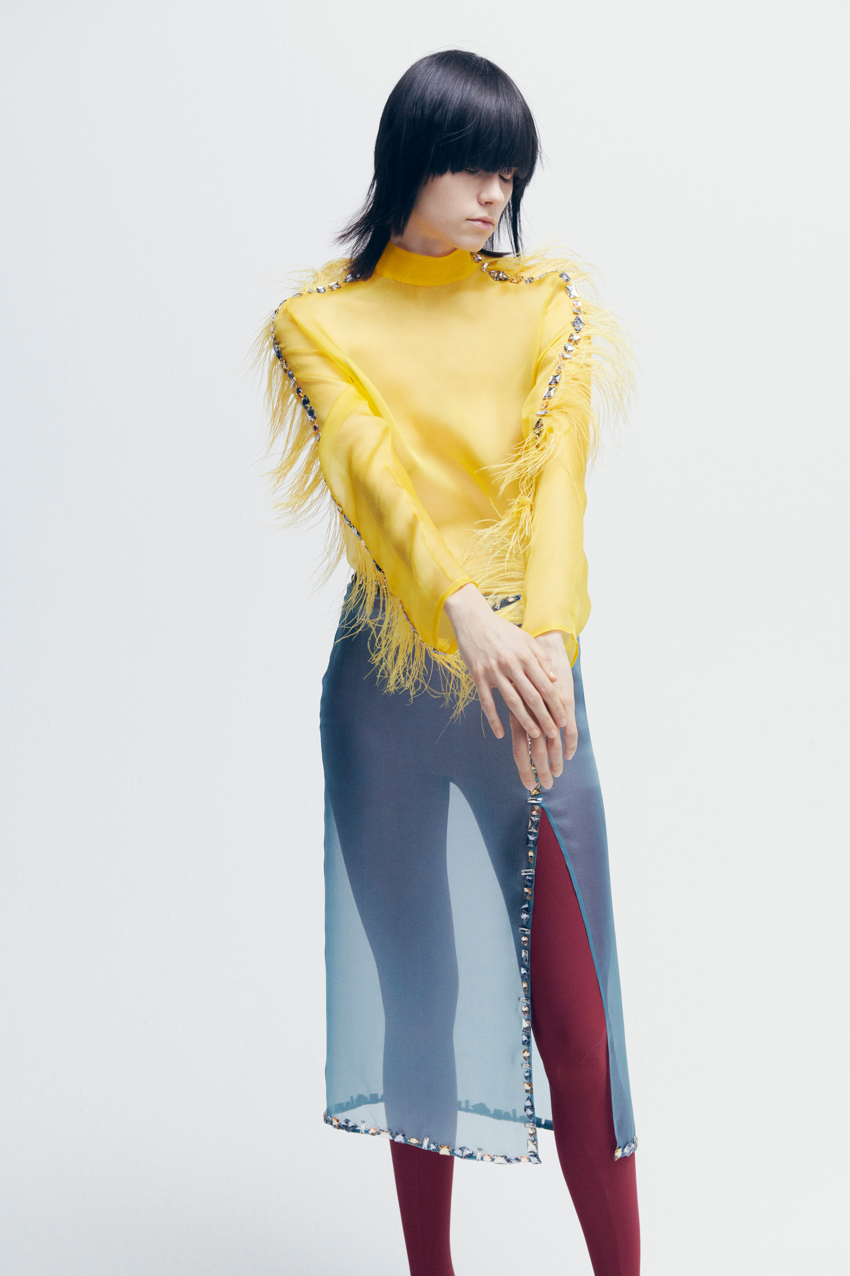 A modernidade impregna a ideia de um guarda-roupa modular, de peças separadas, que podem ser combinadas de maneiras infinitas de acordo com as vontades individuais. Jaquetas bomber acolchoadas, blusões e shorts curtos, polos e bodysuits em jacquard de mohair, túnicas e casacos dupla face, macacões, vestidos plissados leves e vestidos de chiffon com transparências, decorados com cristais e penas são os destaques de uma coleção que carrega todo o DNA da Emilio Pucci, infundido com tons de marfim, amarelo, rosa, laranja, nude e petróleo. Os mesmos tons caracterizam as estampas Cervinia, Cortina d’Ampezzo, Specchi, Clessidra, Nuages e Nappine: prints e desenhos icônicos, direto dos arquivos da Pucci foram atualizados e dessaturados.