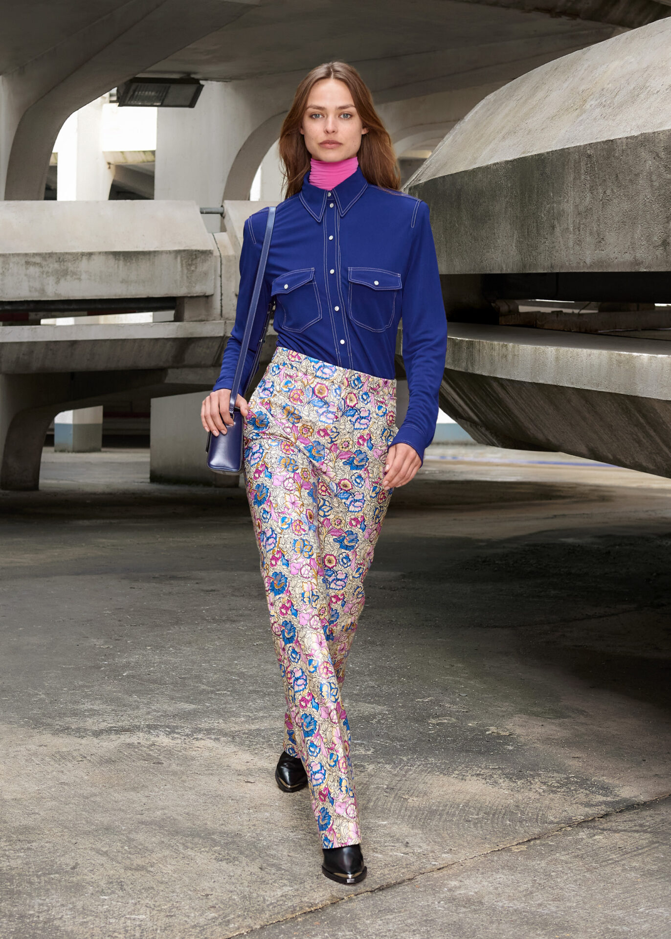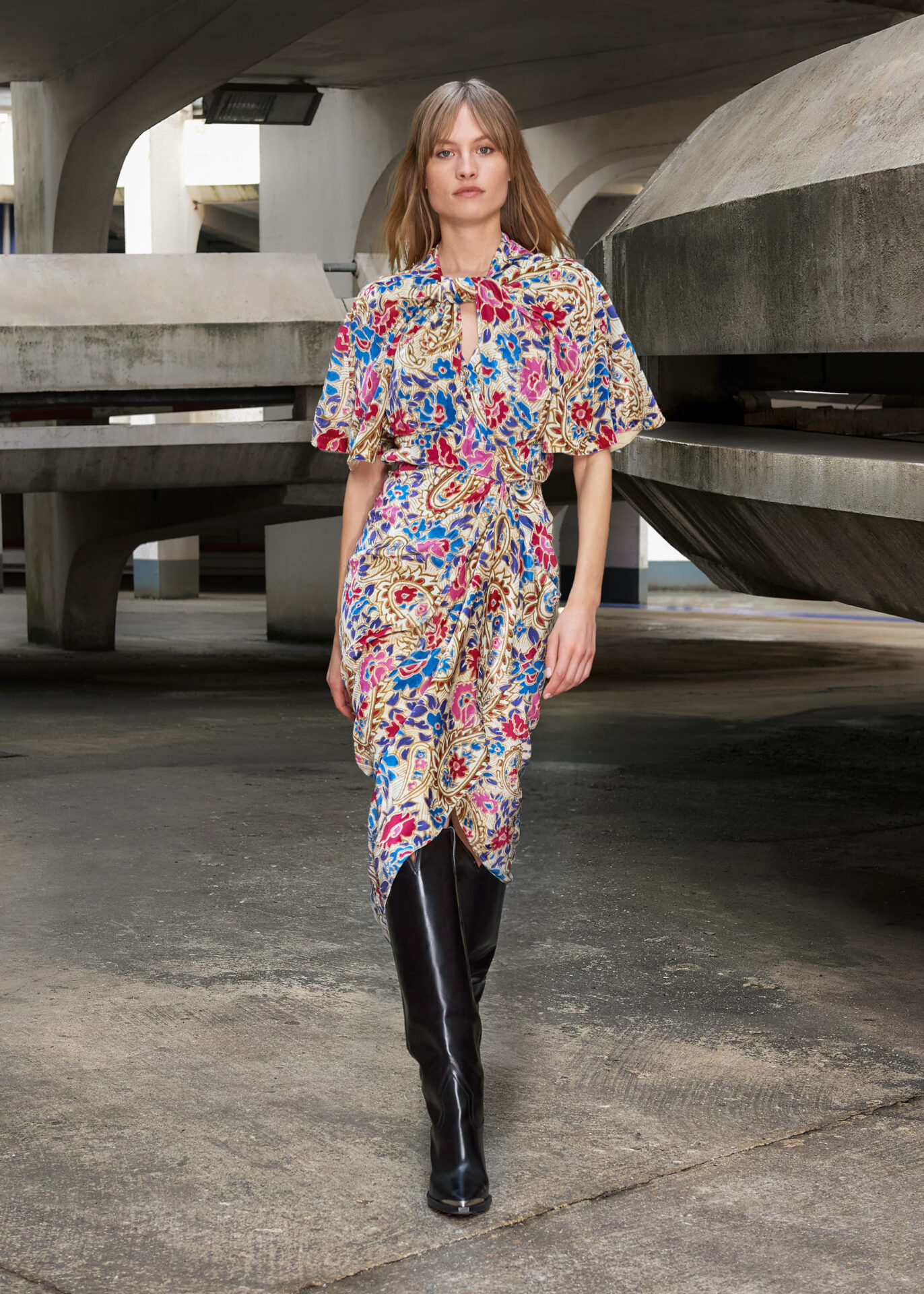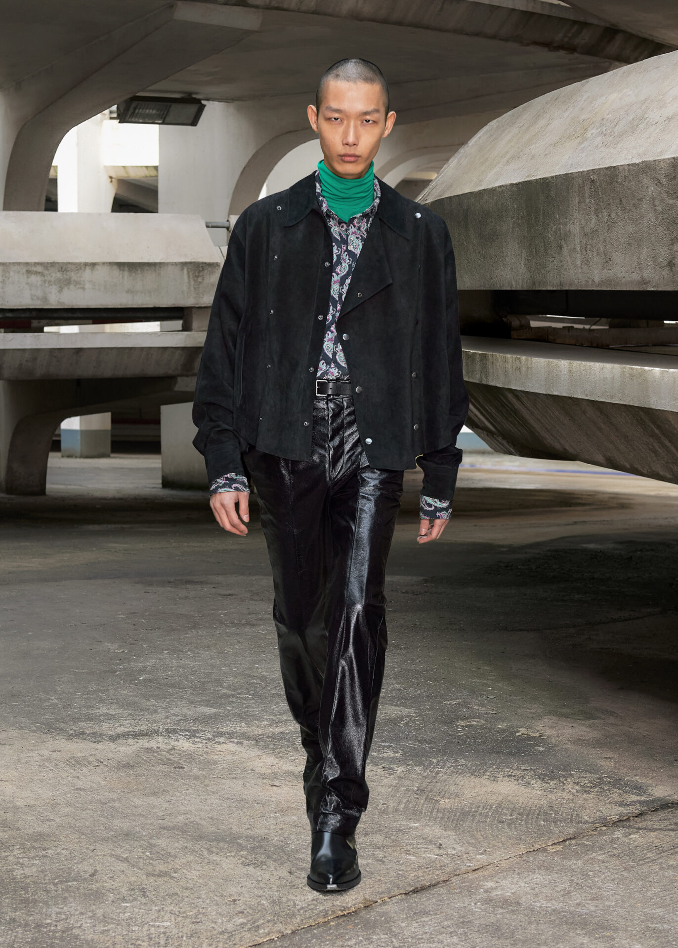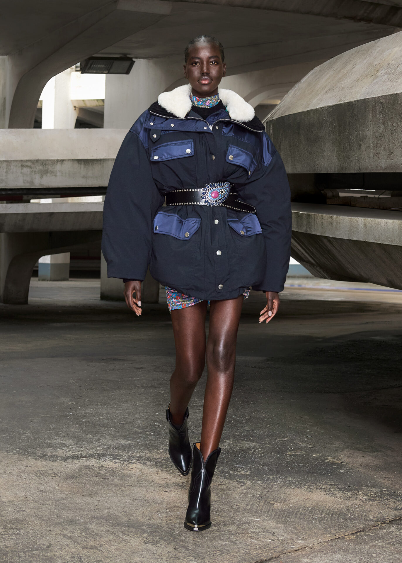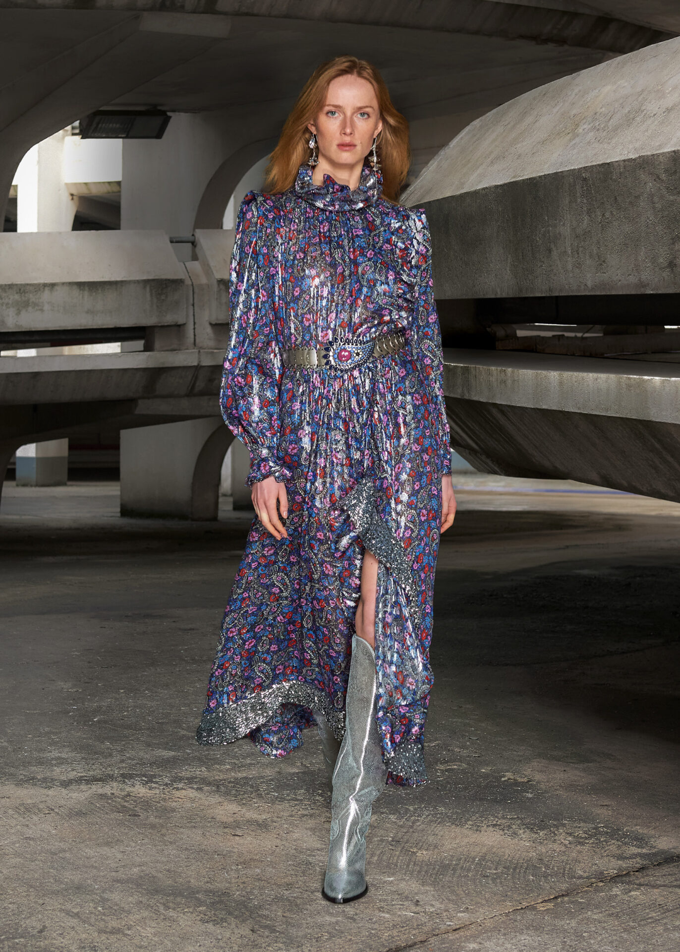 O espírito folk e libertário dos anos 60, impulsionado por Jimmy Hendrix ou Janis Joplin, se une ao ritmo de Gabber, uma subcultura que tomou os anos 90. Padrões florais multicoloridos psicodélicos são cobertos por um azul metálico de vinil, enquanto botas texanas são combinadas com peças inspiradas em roupas esportivas oversized, enfeitadas com cangas coloridas.
