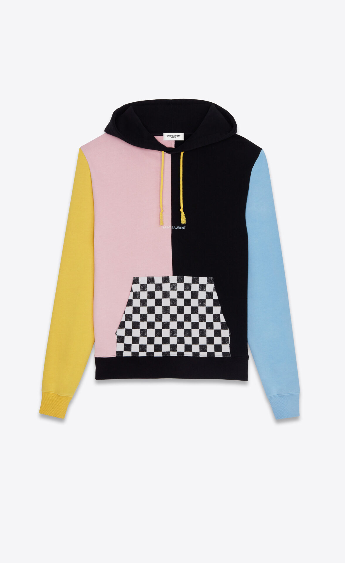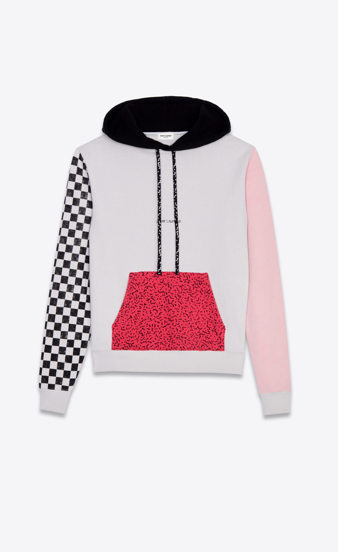 Inspirado na magia do universo ultra-gráfico e muito identificável, lúdico e colorido de seus móveis – Anthony Vaccarello criou para a Saint Laurent uma cápsula exclusiva de dois moletons xadrez multicolor, dois vestidos, uma camisa e dois pares de tênis. Estas peças únicas combinam modelos clássicos de Saint Laurent com o espírito eletrizante de Memphis.